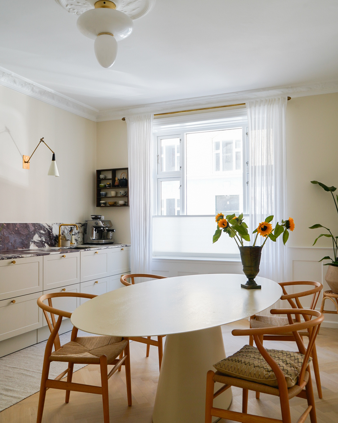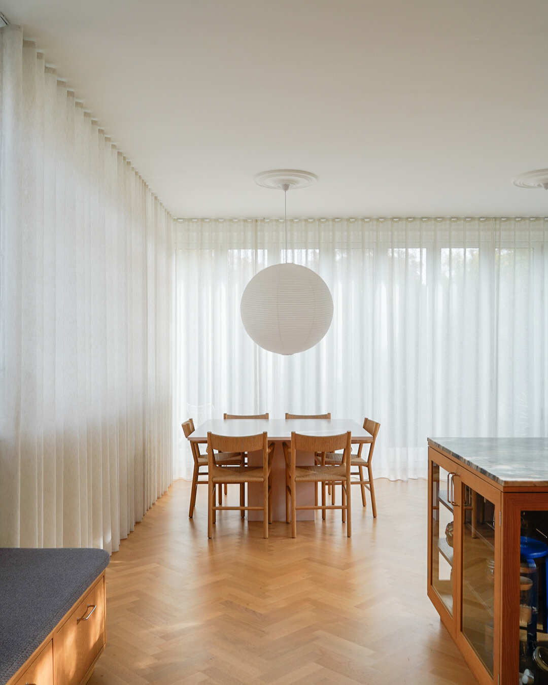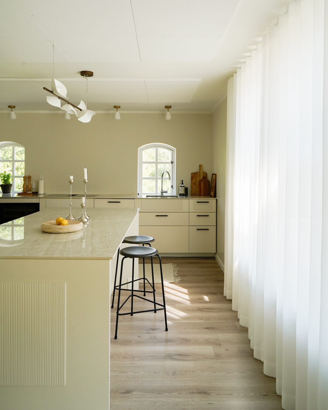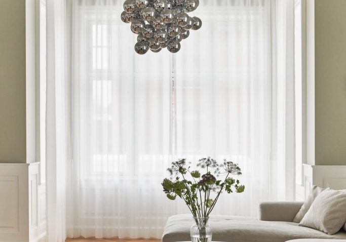 In the kitchen, a long, airy curtain from floor to ceiling has been combined with a folding curtain, which displays its beauty in the most elegant way. The quality of the curtains ties them together in this room, where both styles are presented in accordance with the owner’s wishes and functional needs.